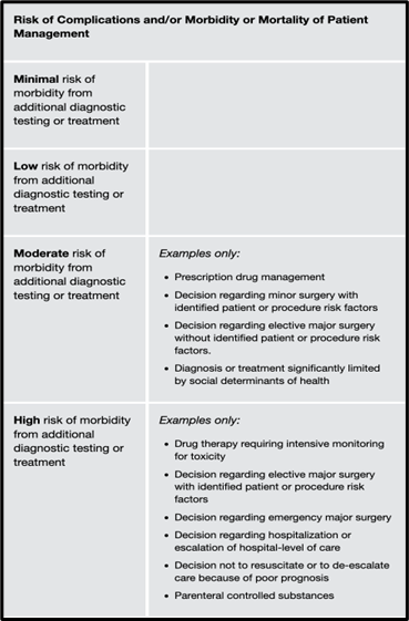 Prescription Drug Management: review of patient’s medication, start/stop of medication, change in dosage, non-narcotic medication administered within the emergency department. Simply listing the patient’s medication in the record will not satisfy this portion of the risk section.