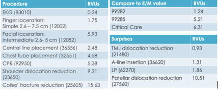 Most of the CPT codes reimbursed in emergency medicine are 99281-99285. However, there are additional items that comprise reimbursement within our speciality. Procedures make up 9% of total reimbursement while critical care performed makes up an additional 8% of the total. Thorough and complete documentation makes the difference when it comes to appropriate billing and subsequent reimbursement. Please see below for common procedures that emergency physicians perform.