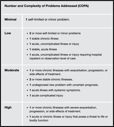 Simply put, just because someone has past medical history indicating diabetes and hypertension does not mean that they are adding to the complexity unless those specific problems are being addressed. For example, consider a patient with past medical history of hypertension and diabetes presenting with signs and symptoms of stroke who is hypertensive requiring intravenous anti-hypertensive medication, or a patient who is being treated for sepsis due to a urinary tract infection with a blood glucose level of 500. As a physician, you would be treating 2 problems: the urinary tract infection and hyperglycemia. Be sure to document all comorbidities affecting the presentation, treatment, and clinical plan as these can increase the complexity of problem addressed (COPA). For example, managing an acute illness with systemic illness or two stable chronic conditions are both deemed to be of moderate complexity, while a severe exacerbation of a chronic condition is a high complexity problem.