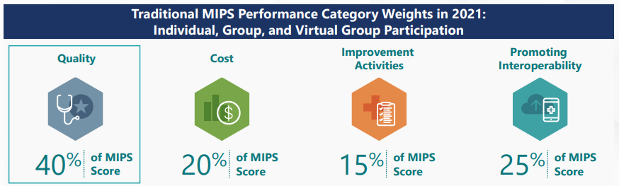 • The weight of the Quality performance category is 40% of your MIPS final score.