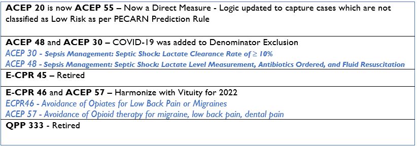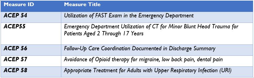 CEDR currently has 16 ACEP (11 continued and 5 new) measures, 9 ECPR (Vituity) measures and 21 QPP measures under the Quality category for Emergency Medicine. All continuous and new measures go through an annual approval through the Self-Nomination Application process developed by CMS.
