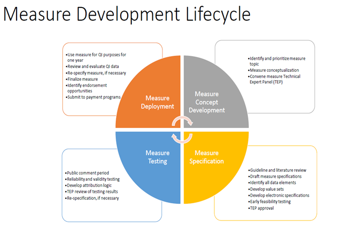 The measure development is a continuous process from the inception of a concept to its development and testing and finally its implementation and integration into the registry.