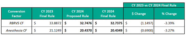 CMS has finalized a CY 2024 Resource-Based Relative Value Scale (RBRVS) Conversion Factor (CF) of $32.7375, which represents an approximately 3.39% reduction from the final CY 2023 RBRVS CF of $33.8872. The final CF for Anesthesia is $20.4349, representing an approximately 3.27% reduction from the final CY 2023 Anesthesia Conversion Factor of $21.1249. The finalized CF update is primarily based on three factors: a statutory 0% update scheduled for the Physician Fee Schedule (PFS) in CY 2024, a negative 2.20% budget neutrality adjustment, and a funding patch passed by Congress at the end of CY 2022 through the Consolidated Appropriations Act, 2023, which partially mitigated a cut to the CY 2023 CF and offset part of the reduction to the CY 2024 CF.