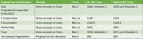 HHS provides the following table highlighting exactly what revenue to report from your tax returns based on what type of group/organization you are: