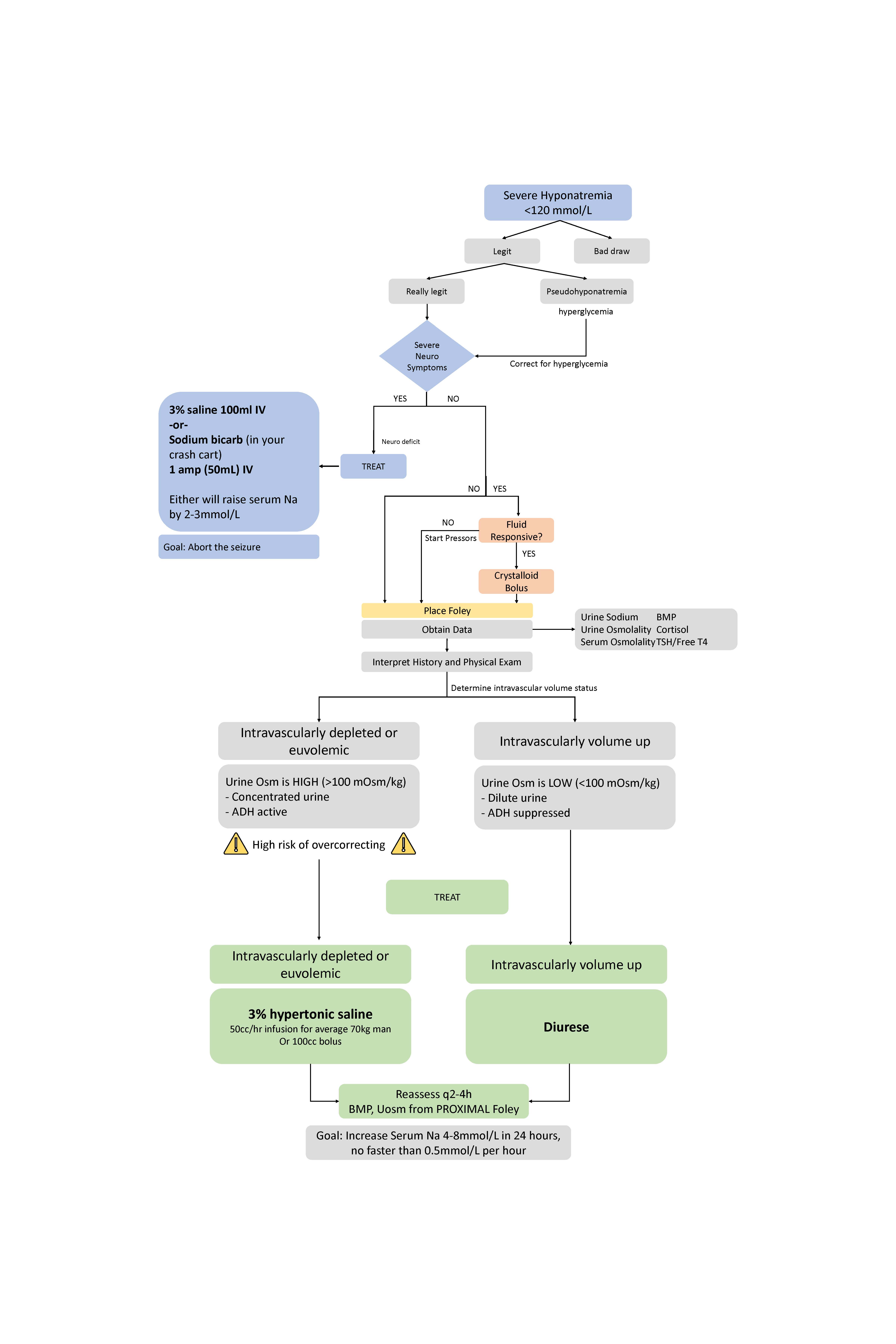 Hypovolemic, euvolemic, and hypervolemic etiologies are traditionally based on physical exam, serum and urine sodium, and serum and urine osmolality. However, labs require hours to complete. Instead, appropriate treatment can be quickly deduced via assessment of intravascular volume status based on history, physical exam, and visual qualification of urine osmolality at the proximal foley. Intravascularly depleted patients (distributive shock, hypovolemia) or euvolemic patients with endocrinopathy, malnutrition, and excessive water or alcohol intake can be grouped by their underlying physiology. These patients appear dry or euvolemic on the exam, they have high urine osmolality due to real or perceived volume depletion and inappropriately active ADH resulting in water retention and worsening their hyponatremia.2 This also includes patients with congestive heart failure or cirrhotics who were diuresed, those with nephrotic syndrome, or patients with significant third-spacing.2 Importantly, these patients are at risk of overcorrecting. Baroreceptors perceive fluid resuscitation as an improvement in intravascular volume status, leading to ADH suppression and subsequent free water loss, thus rapidly increasing serum sodium.1