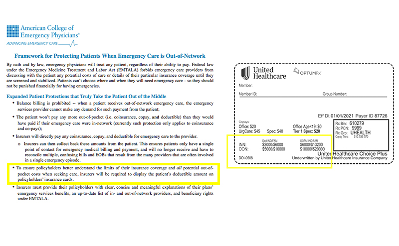 At the beginning of ACEP’s surprise billing advocacy efforts, we asked Congress to require insurance companies to include the patient’s deductible on their insurance card. Our “Framework for Protecting Patients When Emergency Care is Out-of-Network” specified: