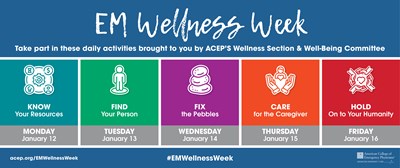 Emergency Medicine Wellness Week is January 12-16 and ACEP’s Well-Being Committee and Wellness Section have organized several activities for each day. Join the events and take some time for your own w...
