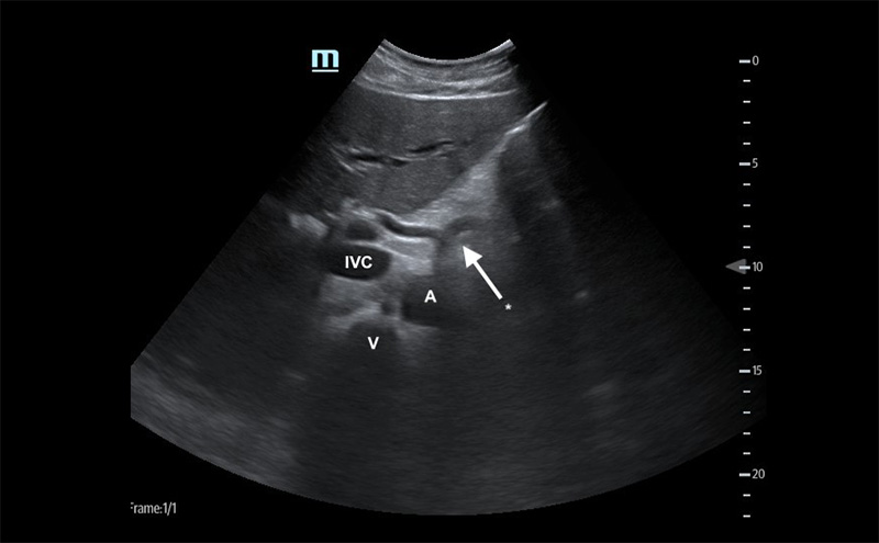 - Identify the arch of the vertebral body in the far field then the aorta just to the patient’s left.