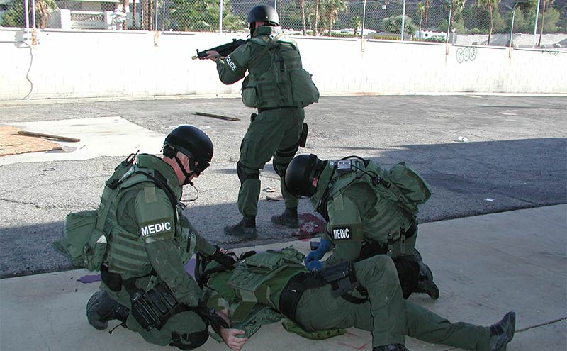 Officer down with injuries- TMPs providing casualty care in a high-threat environment: Photos by Dr. John Wipfler and Dr. Lawrence Heiskell.