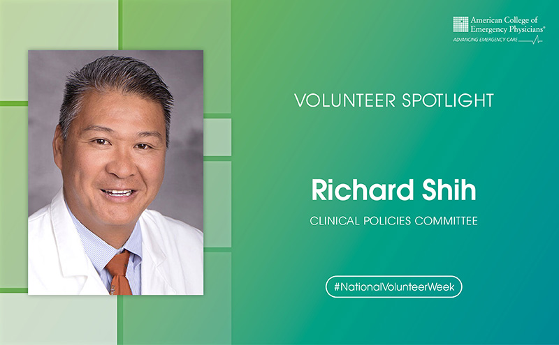 ACEP members and physicians who have worked with him on committee and work groups say Richard Dr. Shih, MD, FACEP, has a positive attitude and a natural ability to motivate volunteers. When he led the ACEP/PALTmed Geriatric Asymptomatic Hypertension Work Group, the final product was praised for its quality and was delivered on time to the Geriatric Emergency Department Accreditation program. Known for his professionalism, Dr. Shih led the creation of the ACEP Naloxone Policy Statement after several challenges presented themselves during the work.