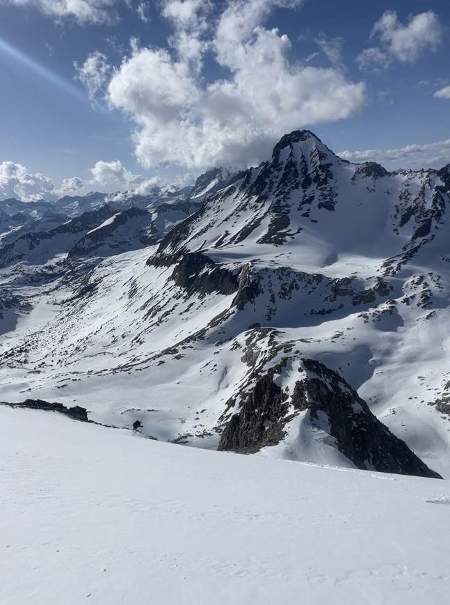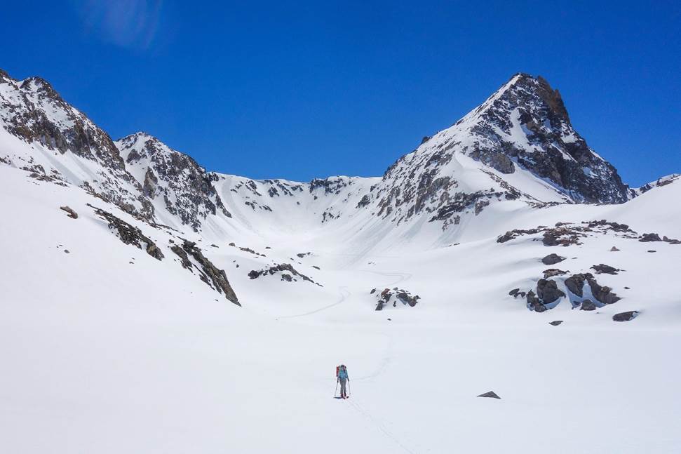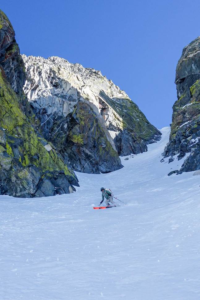 We reached the col on Bolton Brown around 5 pm and finally got eyes on what we were going to ski, well we couldn’t see much as it was a blind rollover. We transitioned and slowly made our way over the roll to see what waited for us on the other side. It was a beautiful position but felt a little spicy for 5 pm after a long day with overnight packs. Luckily the snow was soft powder. As we crested the rollover, we were greeted with a 40-degree couloir and a 1000’ descent down to the lake below, the best descent of the trip.