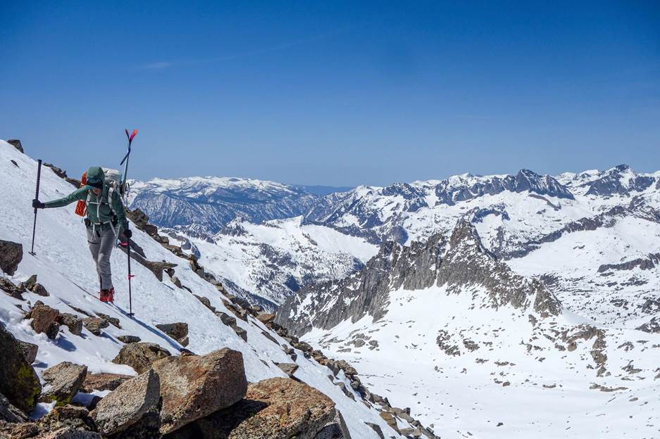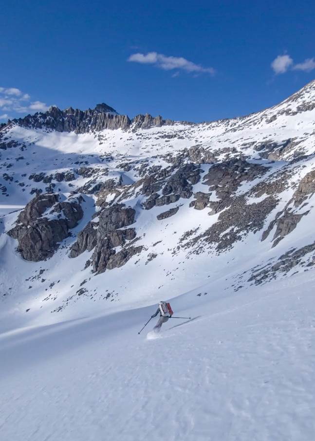 We stopped for a break on a rock slab near Baxter Lake to make water, eat, and dry out skins and boots. An interesting thing we experienced in the Sierra is you’ll be skinning along and sweating buckets but as soon as you stop on a rock slab you’ll be reaching for a puffy. The air temps aren’t actually that high but the solar radiation sure heats you up. After a relaxing slab hang we headed up the hot south-facing slope to Baxter Col. We dropped down the north side and enjoyed a long corn run below Acrodectes Peak. Satisfied with our day, we found a slab above Woods Lake to spend the night on.