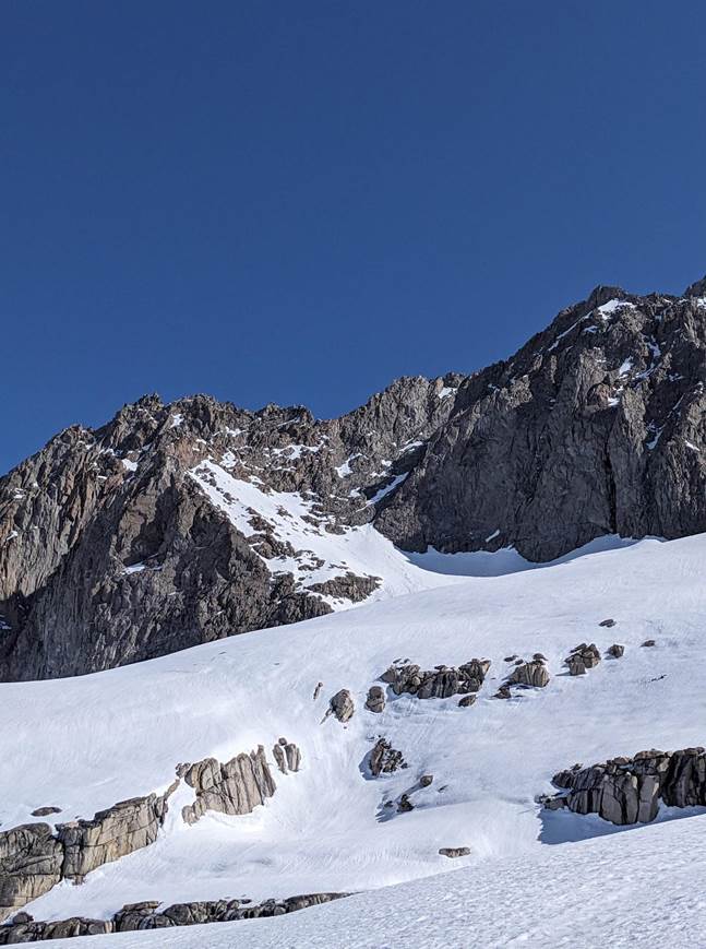 This euphoria quickly came to an end as we entered a south-facing, breezeless, solar oven. There are times in the Sierras when you feel like you are getting cooked and every sweat gland is working overtime. We took a break under the last tree that we could see for a while and discussed our options. It was about 3 pm and our goal was to get to Palisade Lakes. The options were to go over Mather Pass which would be the easiest but least interesting skiing, Twin Peaks which was more interesting skiing but Kyle had done before, or Mount Bolton Brown to a line that we had spotted on the map but had no beta for. We also discussed finding a spot to camp as we had already covered quite a bit of distance. However, going over Mather or Twin Peaks that afternoon made the most sense as they would be corn now and firm in the morning. Bolton Brown was north-facing so it didn’t matter as much when we did it. After getting something to eat and drink and cooling down a bit we decided that we would keep going towards Twin Peaks and Bolton Brown. We could make a final decision as we got closer. So off we went, this time with pocket music on to keep the vibes high. A little while later, Kyle looked back at me and said, “I’m feeling Bolton Brown good, how are you feeling?”. “Let’s go for it!” I replied. So we started the final 2000’ climb for the day.