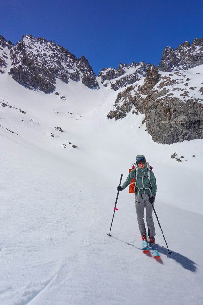 We skinned up to Kearsarge Pass and I was pleasantly surprised that it didn’t feel too bad. Guess the day tours and Diamox had been doing something to help me acclimatize. We crossed over Kearsarge Pass and traversed over to Rixford Pass where we got our first ski descent with overnight packs, in powder! From there we skinned to the base of Dragon Peak and got eyes on the Dragon Couloir.