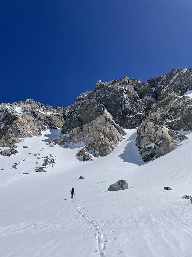 Dragon Peak is a beautiful, jagged peak with the north facing couloir splitting it down the middle. The couloir doglegs halfway down so we only had eyes on the lower part and the apron. We unloaded everything we didn’t need from our packs to ski the Dragon and started booting up the couloir. As we ascended, we noticed that the snow was pretty variable and towards the top there was a thick crust and ice under about a foot of powder. As the couloir increased in steepness the wallowing commenced. Eventually, we were able to overcome the wallow and top out.