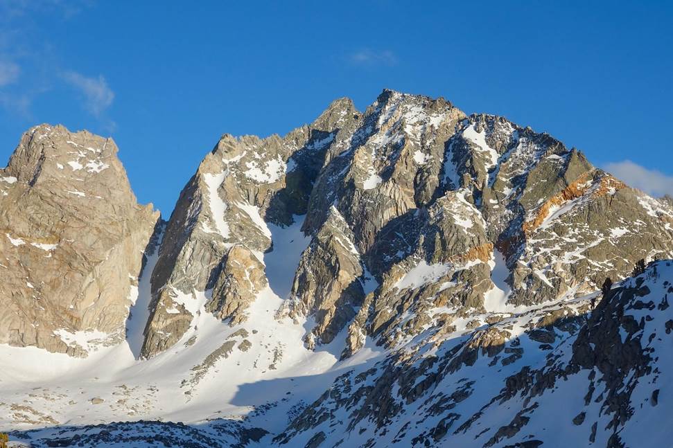 We woke up feeling worked from the day before. As the sun came up, we waited for it to hit our tent before we really got moving. We planned to take a look at Norman Clyde with hopes of climbing up the backside and skiing the north couloir into the Palisades. As we rounded the corner and got eyes on the south side it was clear that it would be a lot of faffing to get up there, it was pretty burned up and would require some scrambling.