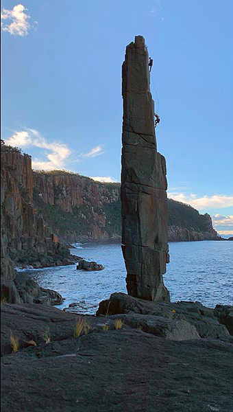 High off the deck on the second pitch of Ancient Astronaut. Located at Fortescue Bay in Tasmania, the Moai Tower is a unique formation of dolerite that belongs on any climber’s bucket list