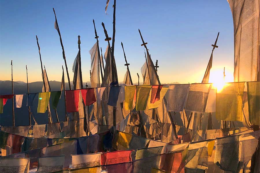 Flag and the God of Compassion at a sky burial site. Bhutan