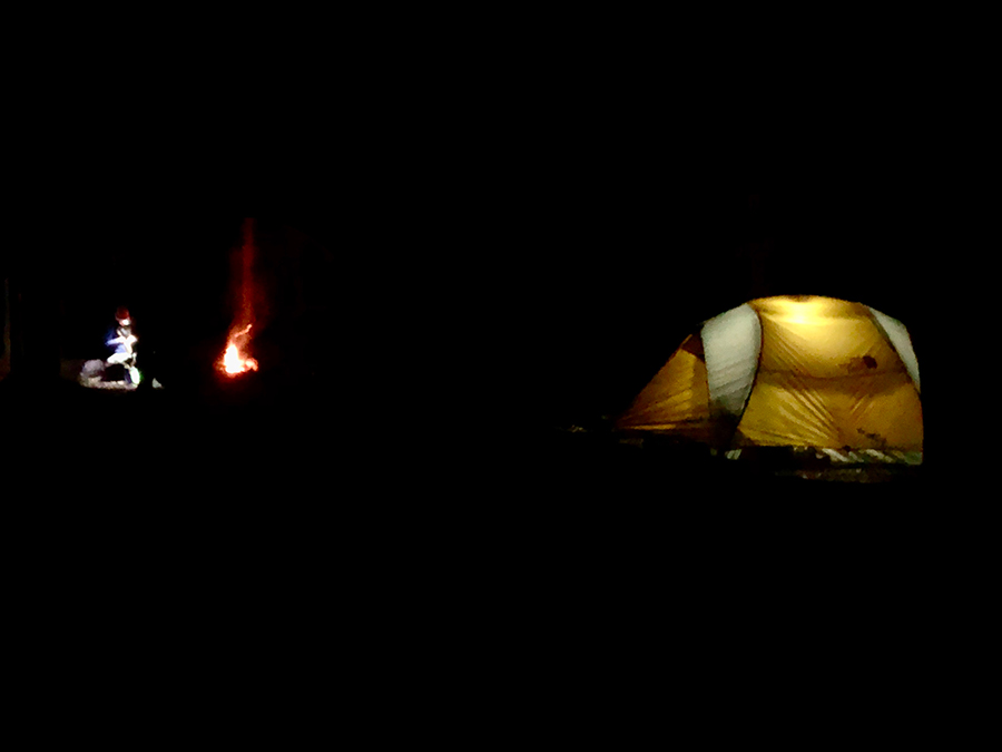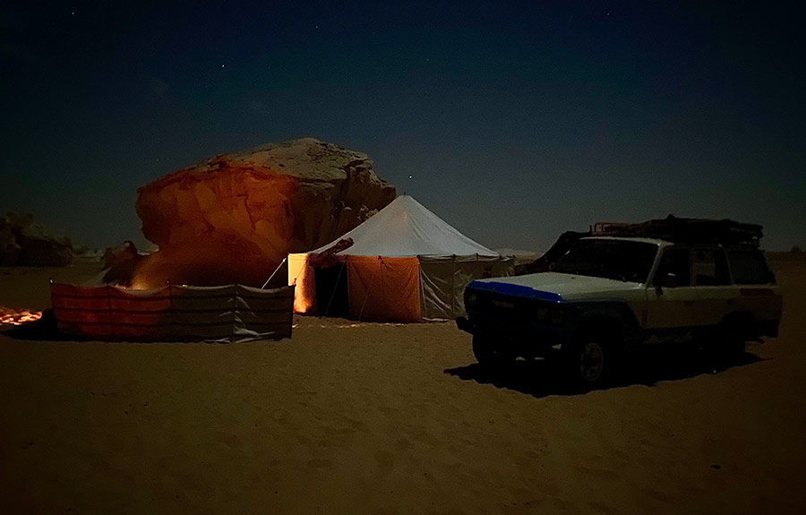 Campfire illuminating tent, car, and large chalk rock formation at camp site in the remote White Desert National Park, Egypt