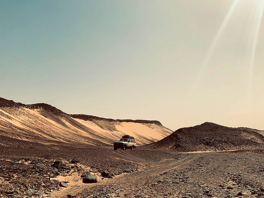 Driving through the Black Desert of Egypt. A land mass covered in volcanic dolerite dating back 180 million years