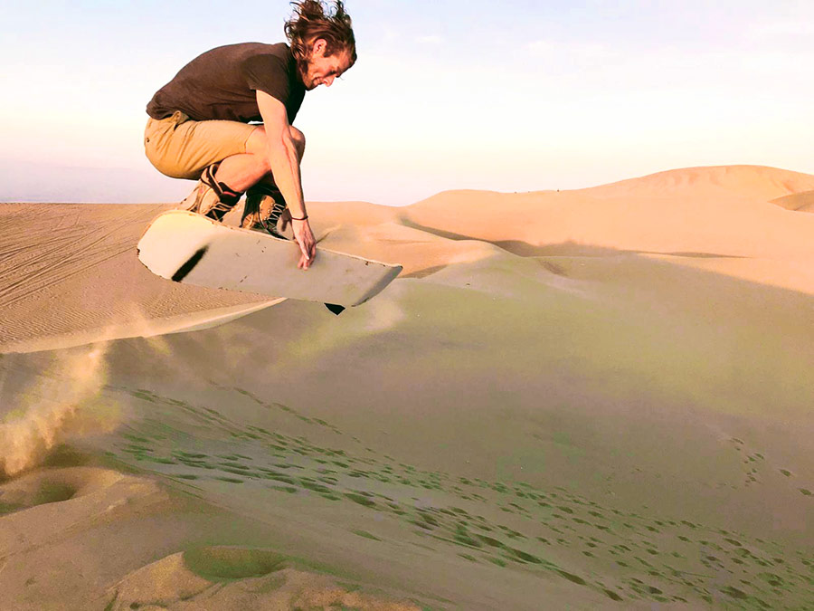 Throwing a little bomb drop while sandboarding in Peru